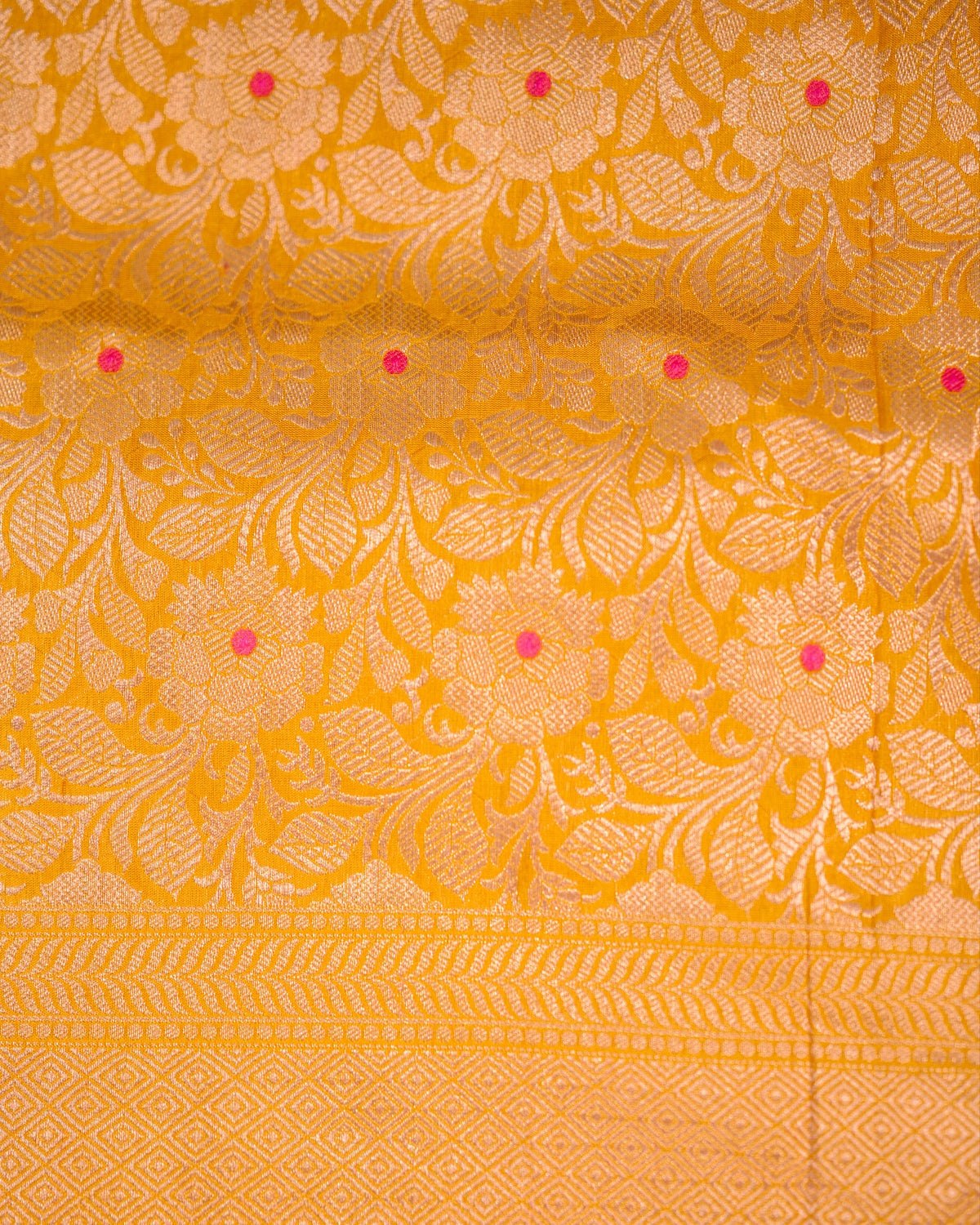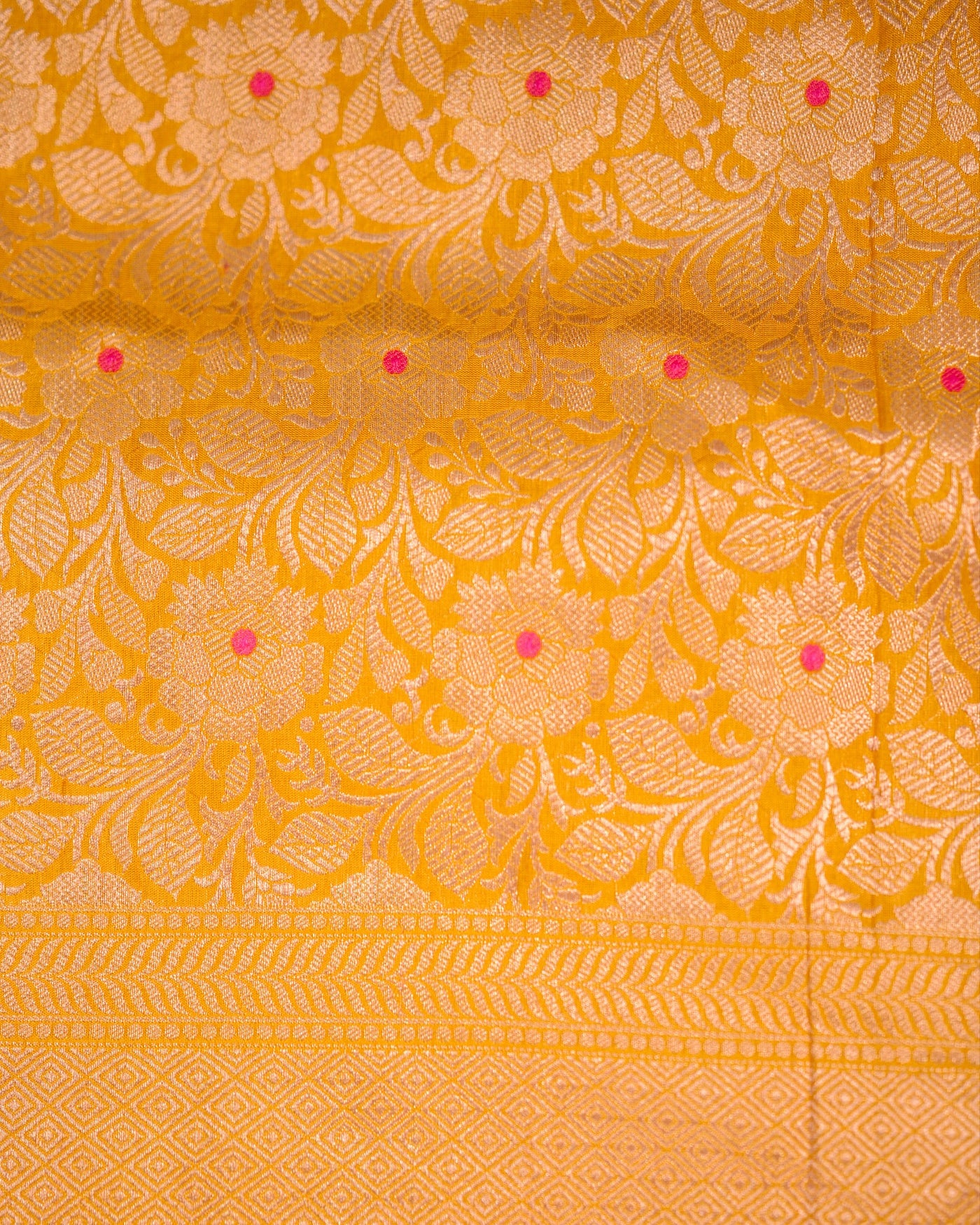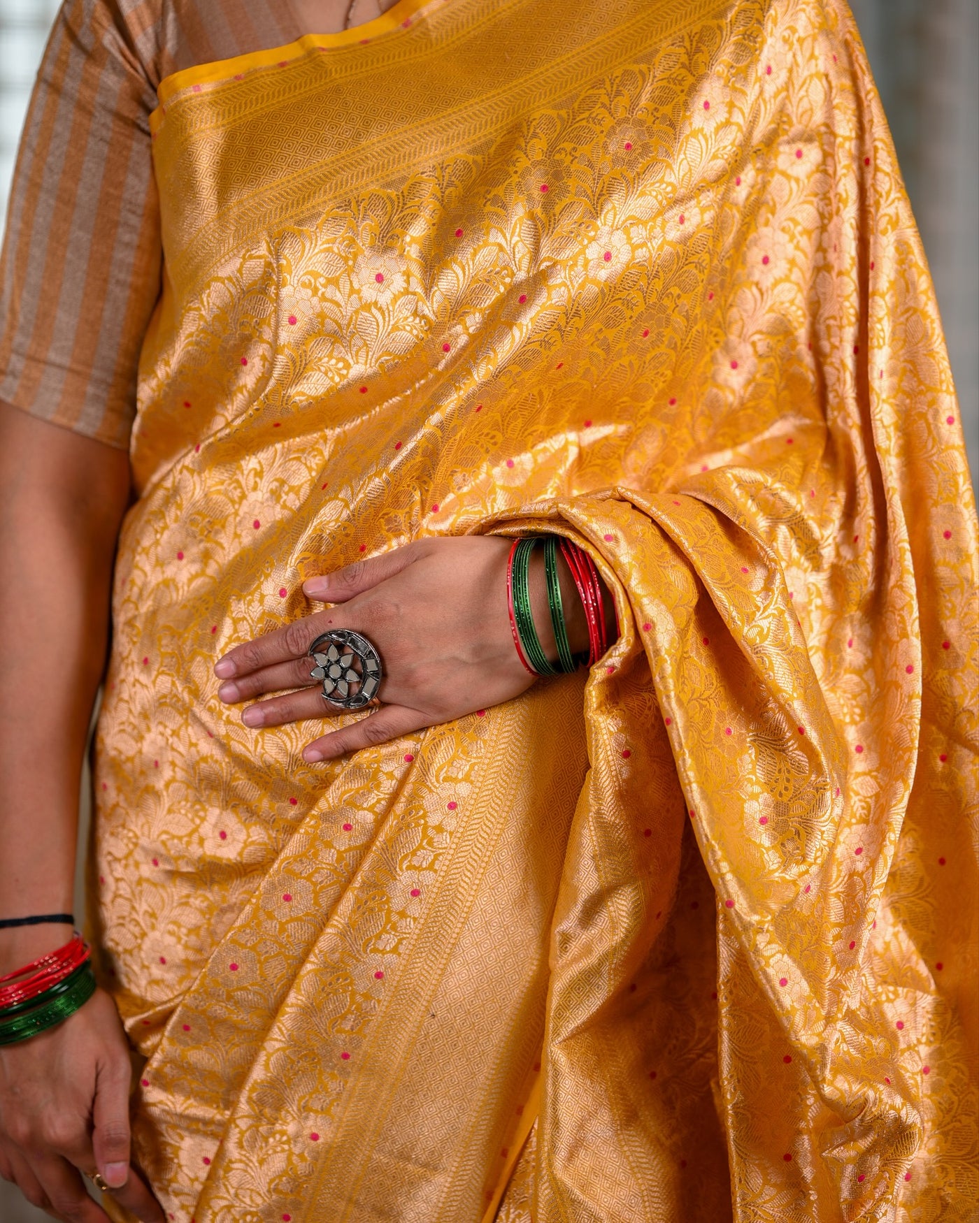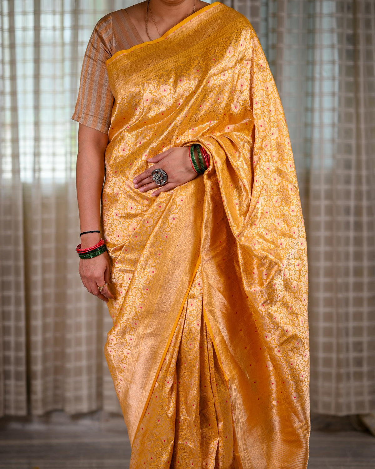 Its rich mustard hue radiates understated elegance, while the smooth silk base ensures a soft, graceful drape. Perfect for festive occasions, traditional functions, or evening gatherings, this saree feels luxurious without being loud - a true reflection of Banaras’ timeless artistry.