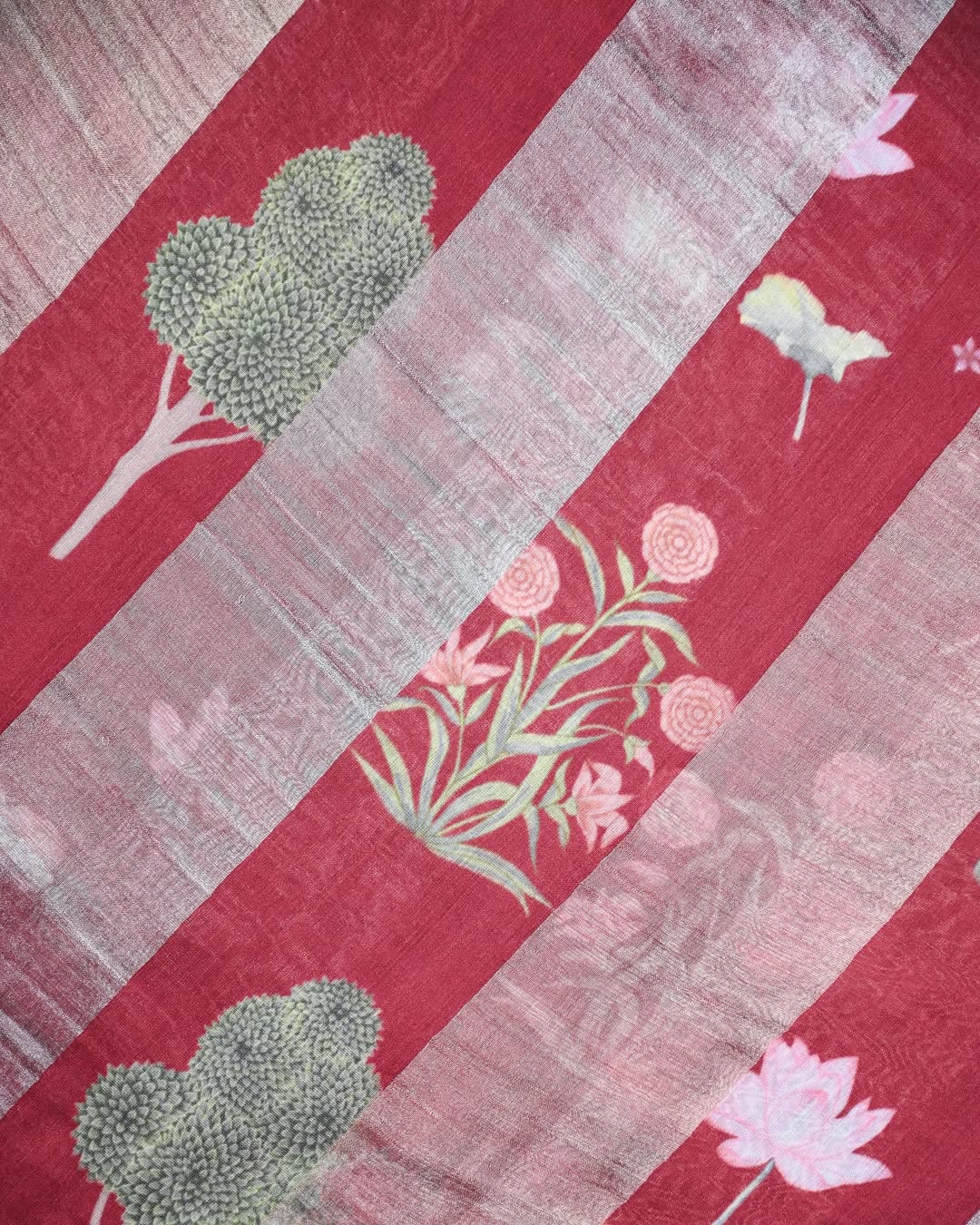 Grace your wardrobe with this Wine Digital Print Tissue Silk Saree, crafted from lightweight, smooth tissue silk that drapes effortlessly. The rich wine base is adorned with elegant digital prints, adding a modern twist to traditional charm, while the soft sheen of the fabric enhances its festive and contemporary appeal. Comes with a matching blouse piece to complete the look.