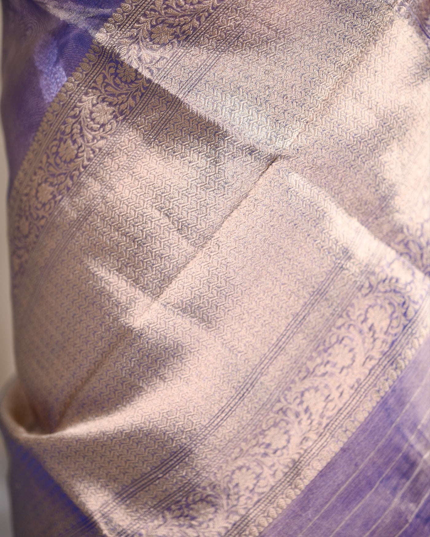 This Banarasi Handloom Kadhwa Tissue Silk Saree glows with a quiet radiance that outlasts trends. Woven with fine zari threads on a shimmering tissue base, the saree reflects light with a soft, graceful sheen rather than a loud shine.